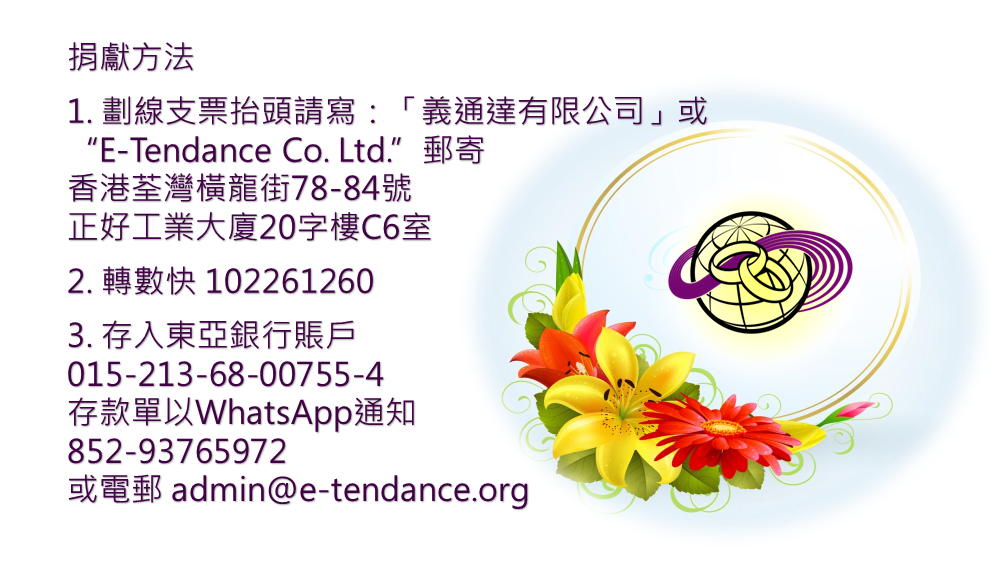 1. 劃線支票抬頭請寫:「義通達有限公司」或 “E-Tendance Co. Ltd.” ,郵寄荃灣橫龍街78-84號正好工業大廈20字樓C6室。