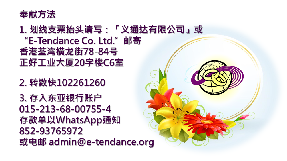 1. 划线支票抬头请写:「义通达有限公司」或 “E-Tendance Co. Ltd.”,邮寄香港荃湾横龙街78-84号正好工业大厦20字楼C6室。